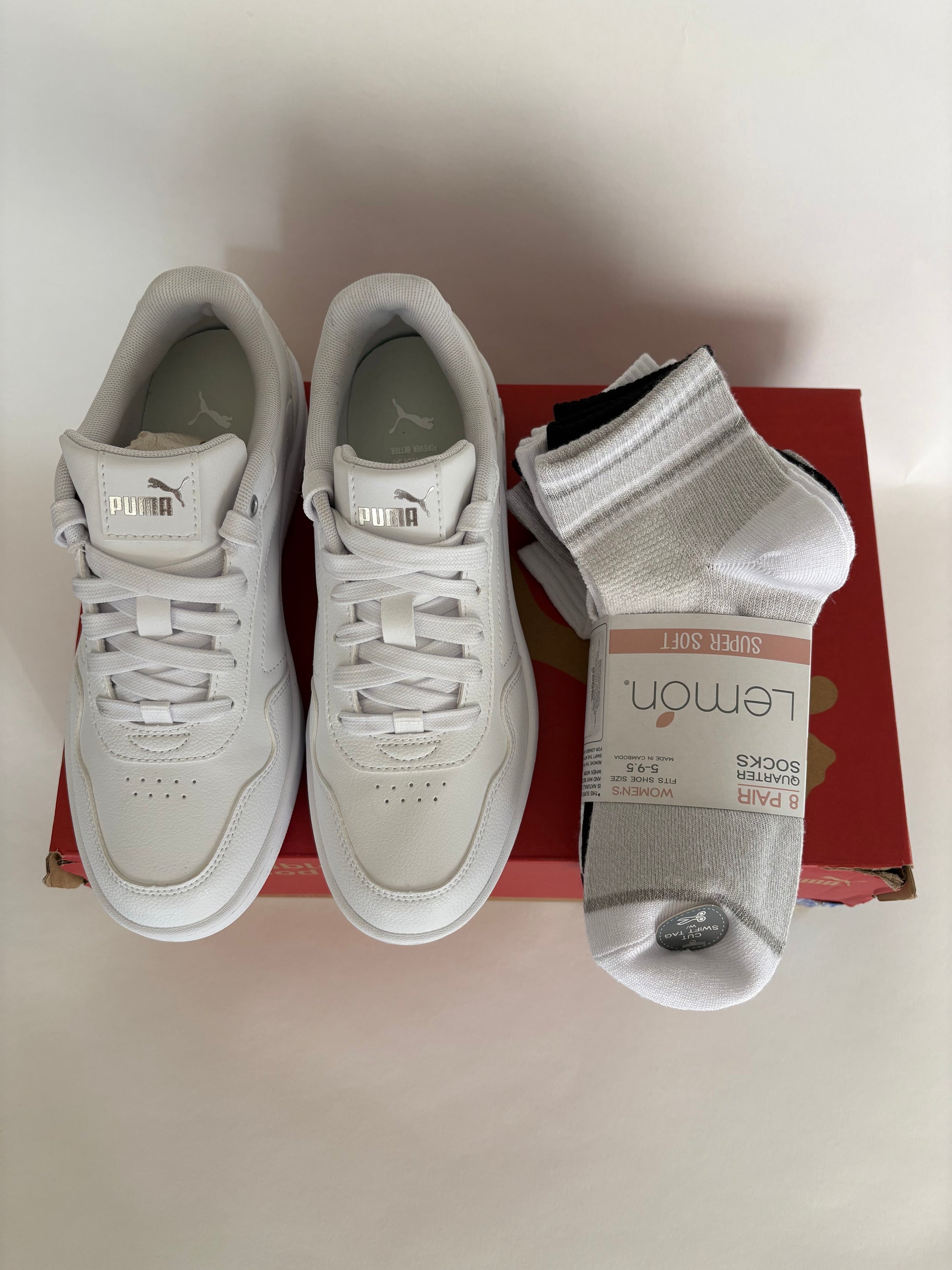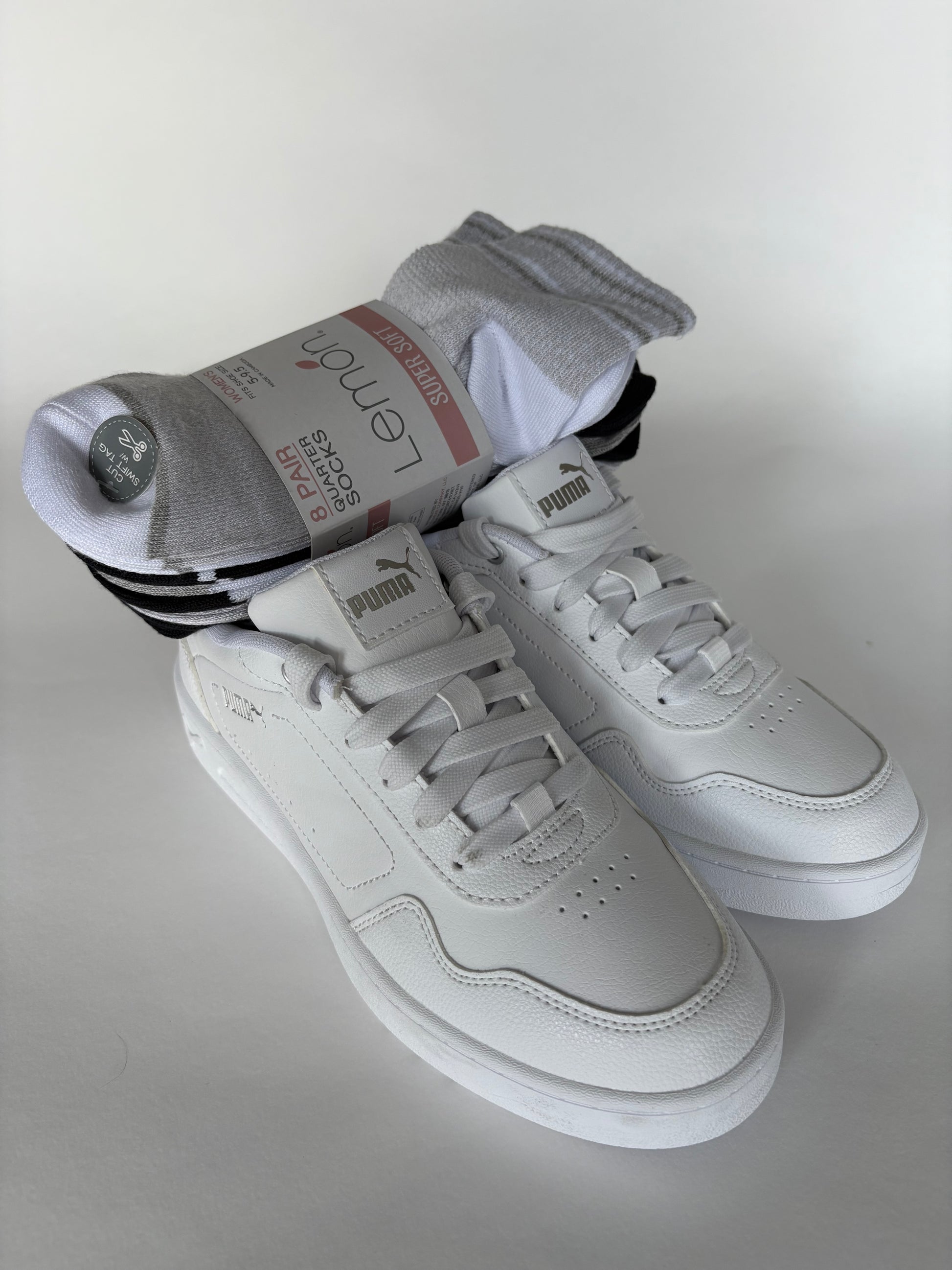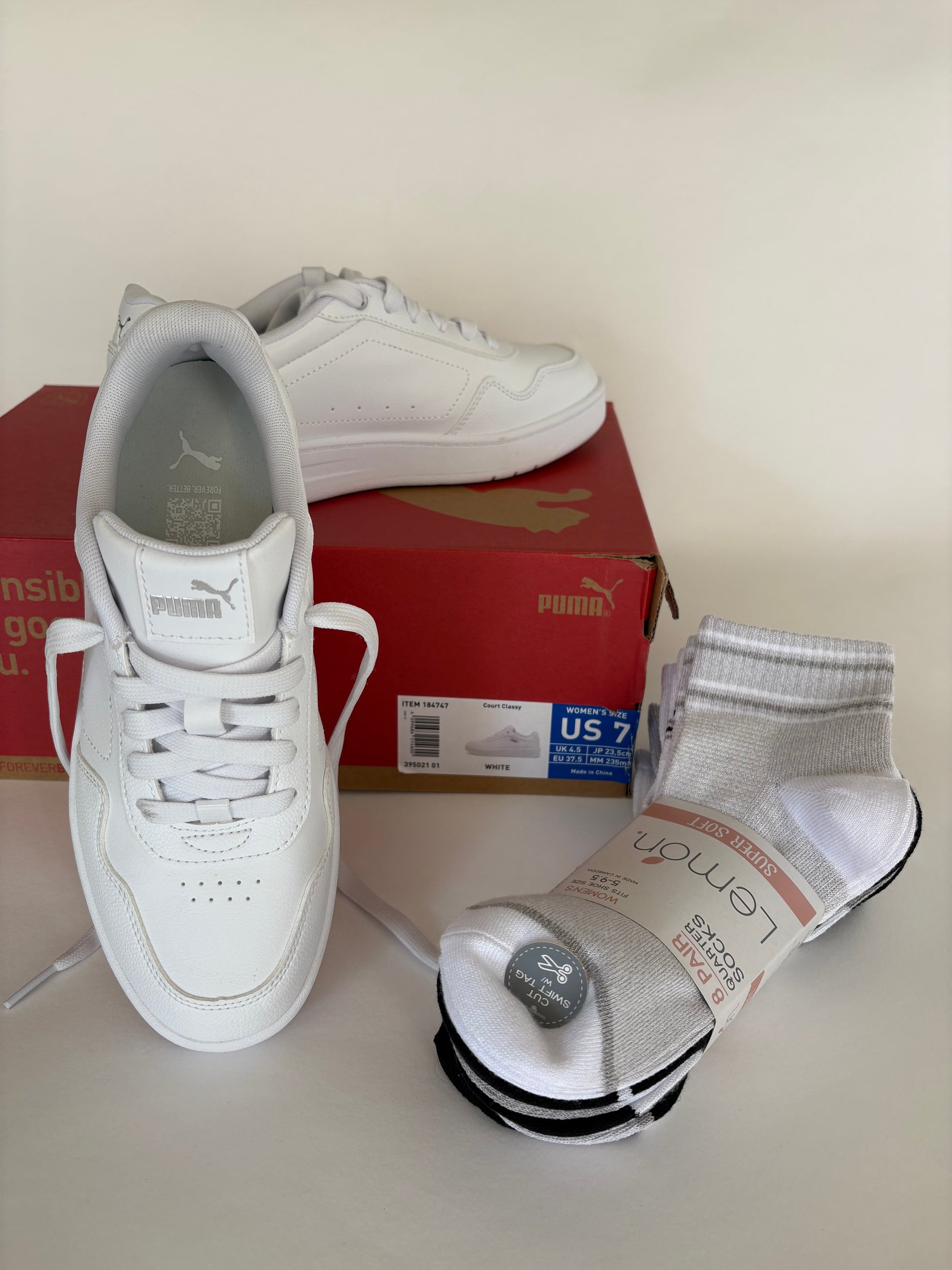 PUMA Court Classy Women’s Sneakers US7 – White + 8 Pairs of Socks